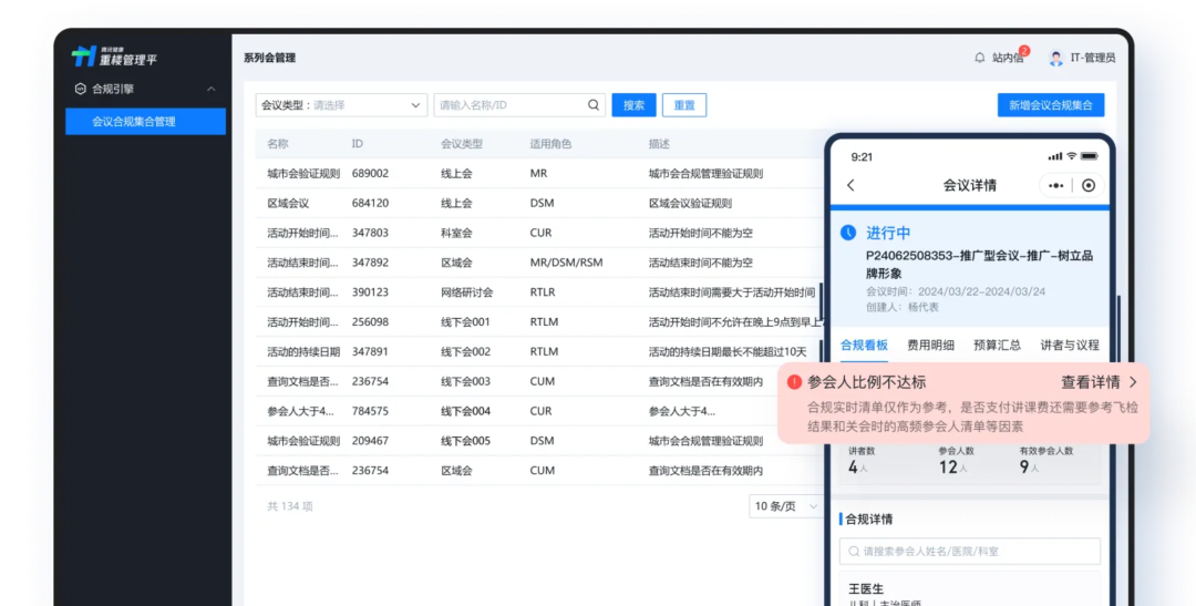 依托 NGES aPaaS 平台强大的合规引擎能力,会议轻量版构建了会中实时合规检查机制。系统可动态监控会议流程中的关键合规管控点,如参会人员在线时长、讲者发言时长等,为药企线上会议提供 “全程在线、实时响应” 的合规护航。同时,面对医药行业政策调整或企业内部合规标准更新,通过 NGES aPaaS 可视化配置平台,即可完成合规规则的新增、修改与生效,从需求提出到规则落地仅需数小时,大幅提升合规响应速度,确保会议管控始终贴合最新合规要求。